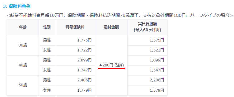 補償内容は、ライフネット生命の「働く人の保険2」と同等ですが、auユーザー向けの特典として、毎月の保険料から200円(非課税)が最大60ヶ月間還付されます。