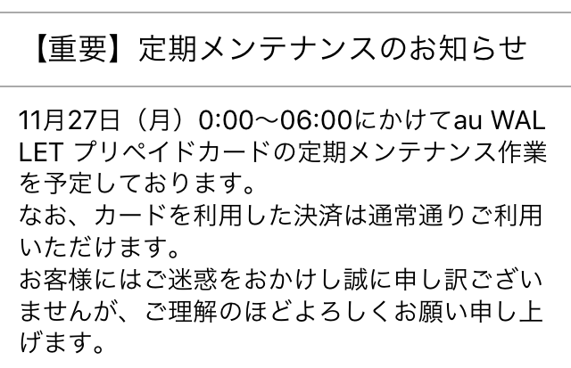 [2017年11月27日] 定期メンテナンス [au WALLET プリペイドカード]